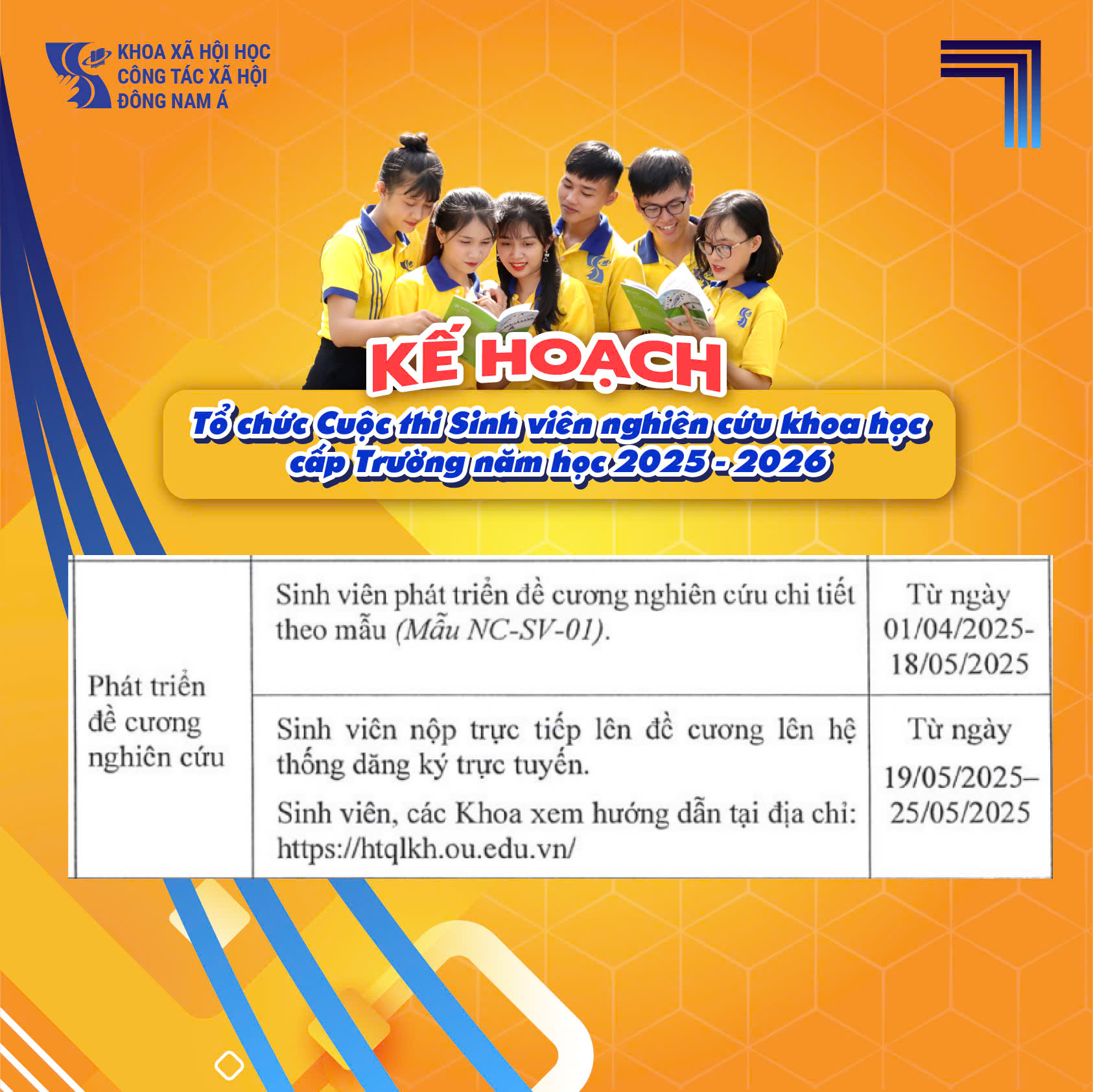 Phòng Hợp tác và Quản lý khoa học trân trọng thông báo triển khai Kế hoạch tổ chức Cuộc thi Sinh viên nghiên cứu khoa học cấp Trường năm học 2025-2026 Thông tin chi tiết vui lòng xem file đính kèm: 16.hcmcou-wUAbb1hRz-KH 395 Trien khai hd SV NCKH cap Truong 2025-2026 Trân trọng./.